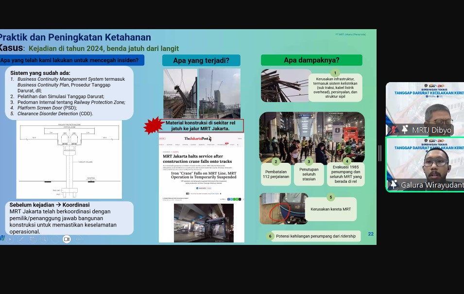 Ditjen Perkeretaapian mendorong standarisasi manajemen tanggap darurat untuk meningkatkan kesiapsiagaan dan keselamatan perkeretaapian nasional secara terintegrasi dan berkelanjutan, melalui kolaborasi dengan Balai dan operator perkeretaapian.