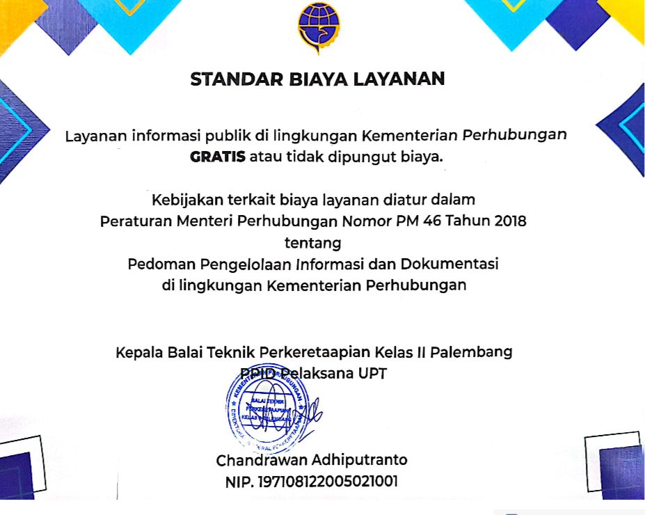 Kebijakan terkait biaya layanan diatur dalam Peraturan Menteri Perhubungan Nomor PM 46 Tahun 2018 tentang Pedoman Pengelolaan Informasi dan Dokumentasi di lingkungan Kementerian Perhubungan.