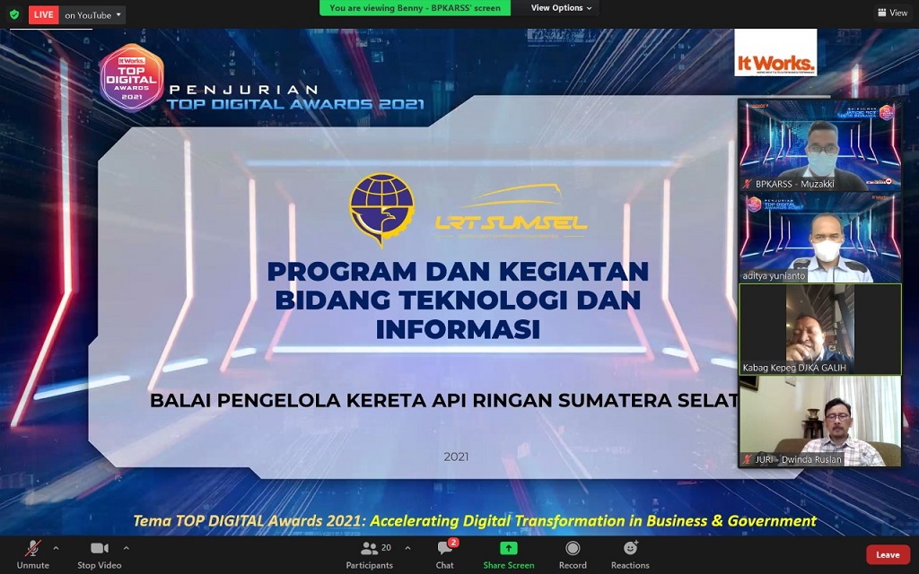 10-12-2021 / 823 Views(Palembang 10/12) - Balai Pengelola Kereta Api Ringan Sumatera Selatan (BPKARSS) terpilih menjadi salah satu finalis dalam ajang Top Digital Award 2021. TOP DIGITAL Awards sendiri merupakan kegiatan tahunan penghargaan bidang teknologi digital (TI & TELCO) yang Terbesar dan Paling Bergengsi di Indonesia yang di selenggarakan oleh majalah IT Works (media Solusi Bisnis, IT, & TELCO), bekerjasama dengan beberapa Asosiasi TI, TELCO, Teknologi Digital, seperti ASPEKTI (Asosiasi Perusahaan Konsultan Telematika Indonesia), IKTII (Ikatan Konsultan TI Indonesia), dan beberapa asosiasi TI dan TELCO lainnya serta didukung oleh Kementerian Komunikasi dan Informasi (Kominfo) dan WANTIKNAS (Dewan TIK Nasional).