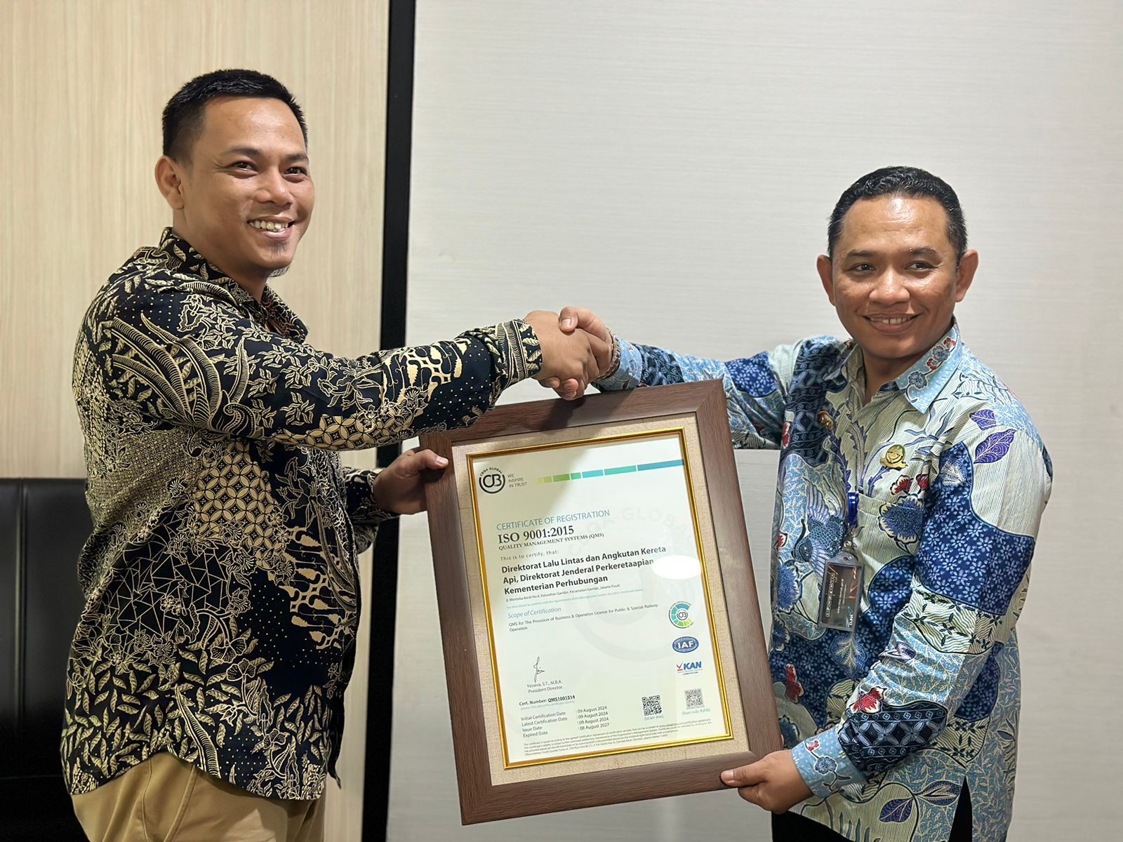 10-03-2025 / 9 ViewsDirektorat Lalu Lintas dan Angkutan Kereta Api mendapatkan penghargaan sertifikasi ISO 9001:2015 Sistem Manajemen Mutu atas keunggulan dan peningkatan pelayanan perizinan usaha, dimana perizinan usaha ini terdapat pada Subdirektorat Kerja Sama dan Pembangunan Usaha yang dikepalai oleh Kepala Subdirektorat Ibu Rosita.