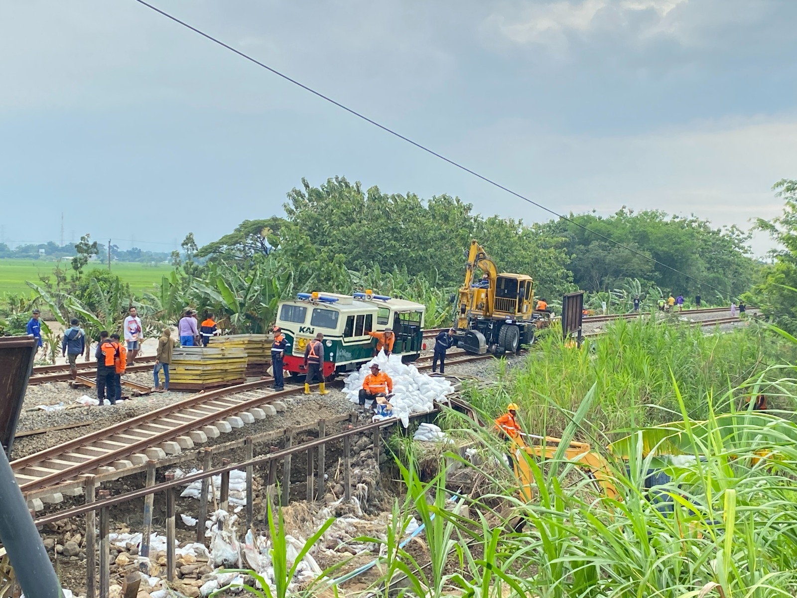 Grobogan - Balai Perawatan Perkeretaapian (Baperka) ikut respon cepat pada dampak bencana banjir dan tanah longsor yang melanda Kabupaten Grobogan di Provinsi Jawa Tengah. Rabu siang (22/1/2025), terpantau satu sarana perkeretaapian excavator Baperka berada di atas jalur rel tepat beberapa meter dari lokasi rel kereta amblas. Satu excavator lain tiba di lokasi beberapa waktu kemudian.