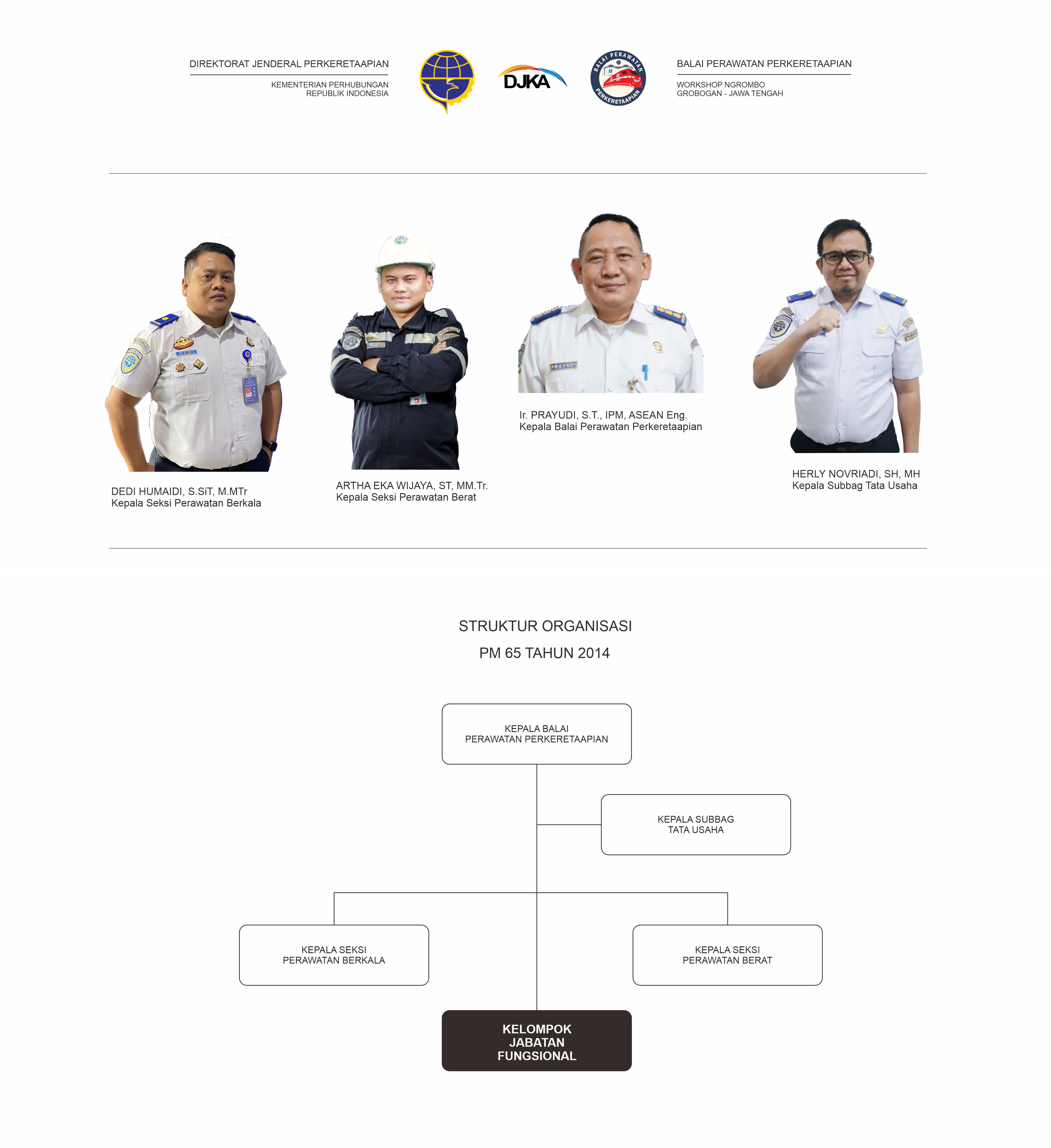 Balai Perawatan Perkeretaapian didukung dengan tiga bagian kerja, pertama Subbag Tata Usaha, kedua Seksi Perawatan Berkala, ketiga Seksi Perawatan Berat.