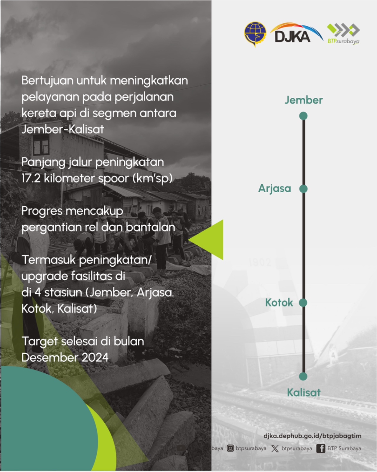 26-06-2024 / 1189 ViewsSurabaya - Sebagai salah satu upaya untuk meningkatkan kualitas perjalanan kereta api di wilayah Kabupaten Jember dan sekitarnya, Balai Teknik Perkeretaapian Kelas I Surabaya melakukan pengerjaan berupa peningkatan jalur kereta api pada lintas antara Stasiun Jember sampai Stasiun Kalisat. Per hari Selasa (25/6) ini, progres pengerjaan peningkatan jalur KA ini mencapai 20% dari keseluruhan proyek.