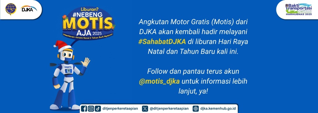 20-05-2025 / 23 ViewsAngkutan Motor Gratis (Motis) dari DJKA akan kembali hadir melayani #SahabatDJKA di liburan Hari Raya Natal dan Tahun Baru kali ini.